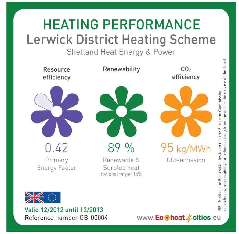 | Ecoheat4cities.eu awarded the attached performance certificate in 2012. The purple flower rates the efficiency of the primary energy factor (heat from the incinerator which would otherwise be wasted), the green flower rates the use of renewable and surplus heat and the orange flower rates the scheme's CO2 emissions efficiency. The more the flower is coloured in, the better the rating. |